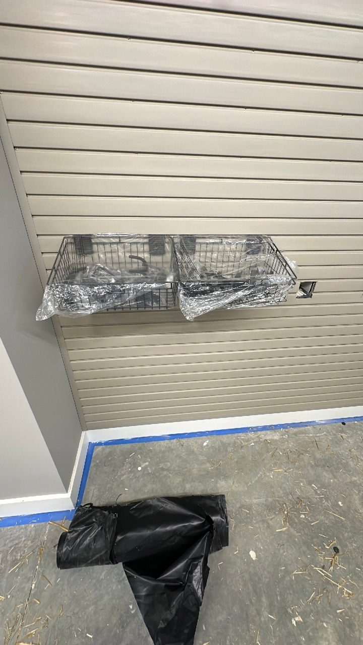 Discover our organizational systems designed to maximize your closet space. Our white closet interior with black hanging rod and wire basket shelf on slatted wall offer a functional and efficient storage solution, keeping your belongings neatly organized.